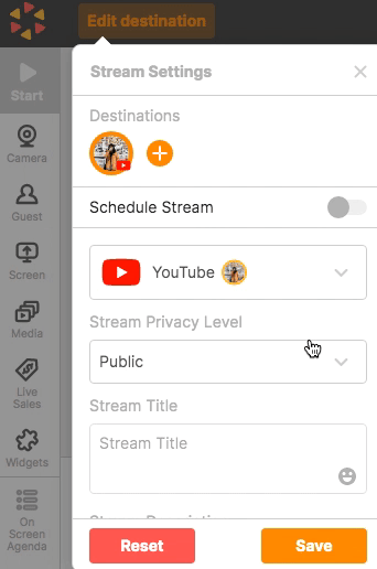2. Click Set Destination on the top left section of the studio and choose YouTube.