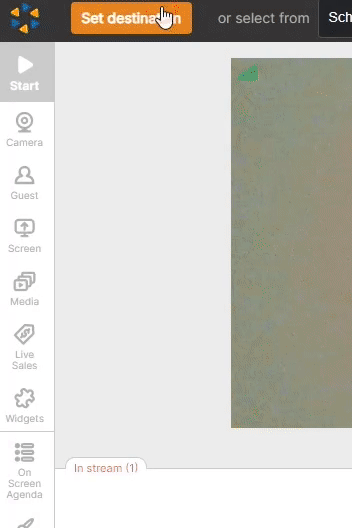Use the Show in Stream toggle to push your camera to the broadcasting section. Afterwards, click Start to begin your broadcast. A 3-second countdown will appear to signal the start of the stream. To end your broadcast, click the stop button: