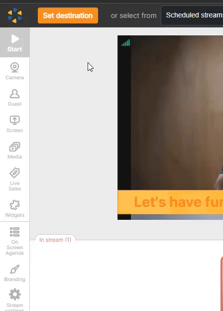 Move yourself to the broadcast by clicking the Show in Stream toggle