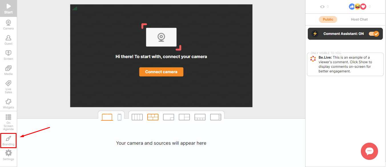 Head to the Be.Live studio and find 'Branding' in the toolbar: