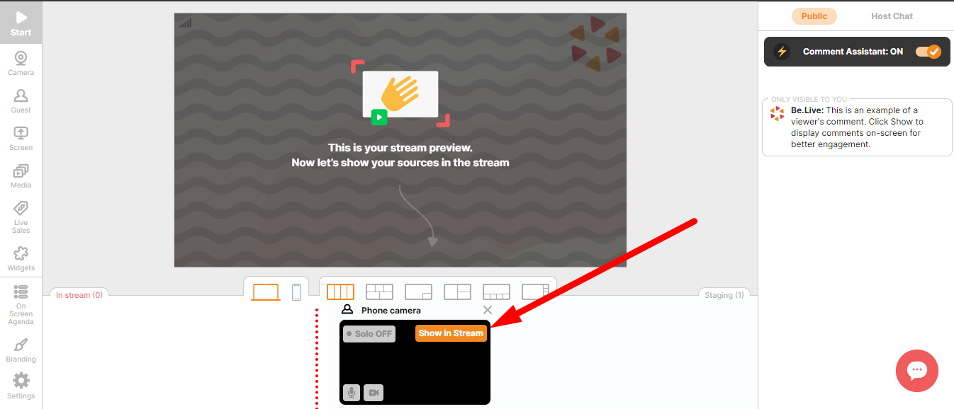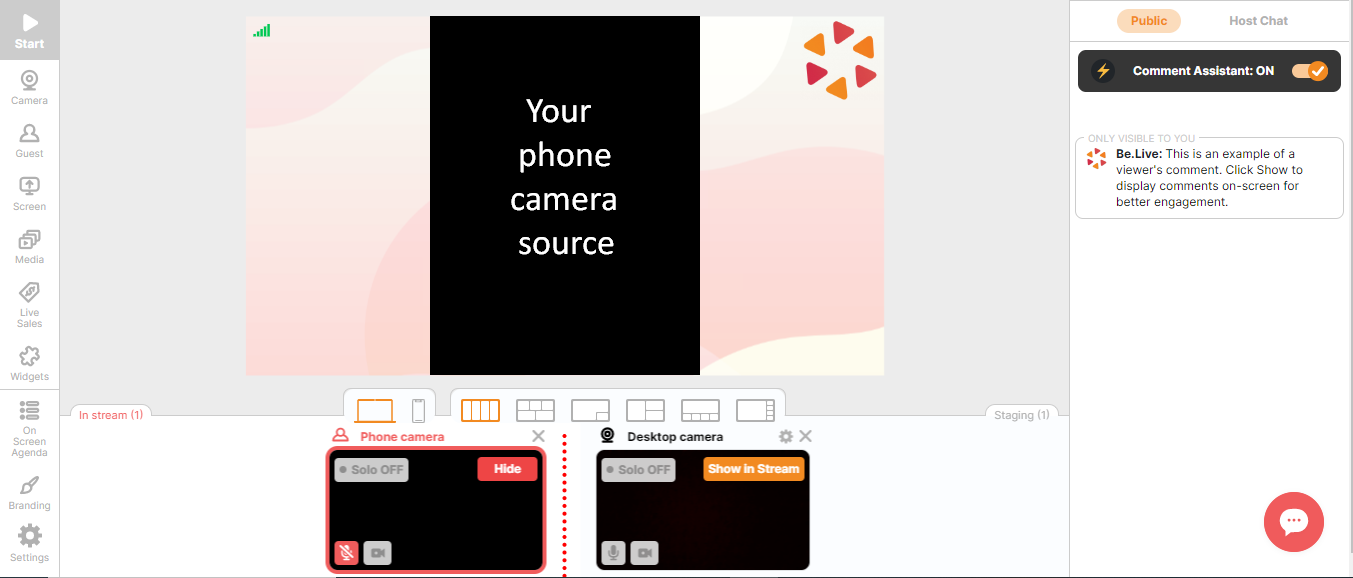 - You've now successfully joined the studio! If you check the Be.Live studio from your host device (laptop/computer), you will see your mobile camera appear as a source in the staging area. To connect it to the broadcast, click Show in Stream.