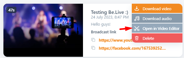 From the Studio, click your profile photo on the upper right corner > My Streams > choose the broadcast you want to edit > choose the Scissors icon > click Open in Video Editor, after that the desired video will be opened in the Editor and you'll be able to edit it. Learn about the main sections of the Video Editor here.
